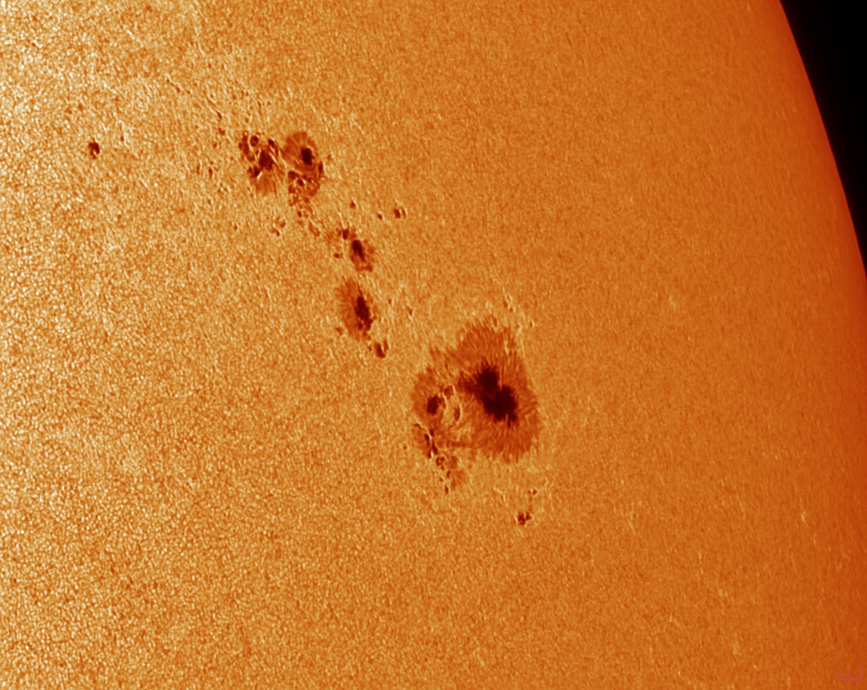 Object: AR3234 met Baader ND3.8 en Continuum filter. Telescoop: Intes MK-72 180/1800 met 2x barlow. Camera: Basler acA1280-60gm